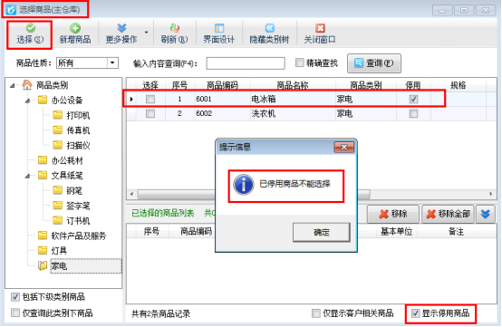 信管飛RMS(進銷存一體化軟件)、信管飛倉庫管理軟件、信管飛送貨單軟件都可以對商品信息進行管理,如果有些商品開過了單據,您以后不再使用該商品進行開單了,可以把該商品設置為停用狀態。已停用的商品無法被用于開單,選擇商品窗口可以隱藏已停用的商品。如何把不用的商品設置為停用呢?本篇文章以信管飛RMS專業版為例詳細介紹一下如何把商品設置為停用狀態。 在功能導航窗點“基礎資料”—》“商品信息”即可進入“商品信息”界面,如圖1所示,以商品“電冰箱”為例,選擇商品后,點擊“修改”按鈕,勾選“已停用”,然后點擊“保存”按鈕,此商品被設
