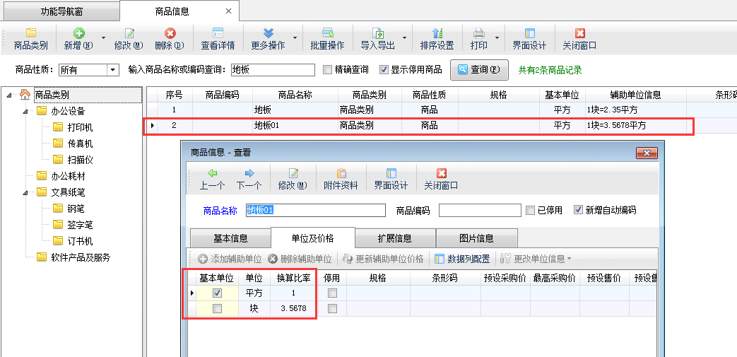 進銷存軟件中支持多計量單位,可以添加商品輔助單位,即同一個商品存在多個不同的計量單位,這幾個單位之間存在一定的換算關系,開單時不管輸入哪一個單位,軟件都可以根據換算比例來自動進行換算轉換。輔助單位信息內顯示多單位換算關系,默認保留兩位小數顯示(如下圖所示),如需設置保留多個小數位顯示,系統也支持通過參數配置進行設置,本文介紹一下如何設置商品單位換算比率小數顯示位數。 在功能導航窗點擊“系統管理”—》“系統參數配置”—》“業務參數”打開業務參數配置界面,然后在業務單據相關參數中打鉤啟用“商品單位換算比率小數位數”參數,并設