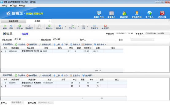 拆裝單用于處理進貨時為組件、配件、原料等,但銷售時卻是成套銷售的,比如電腦經銷商,采購的是電腦配件,但實際銷售的是整機。也有購入的是整機,但銷售的時候是按單個配件進行銷售的情況,也可以使用拆裝單進行處理。 信管飛RMS專業版、信管飛倉庫管理軟件中包含拆裝單功能的使用,下面我們以信管飛倉庫管理軟件為例來演示一下具體的操作步驟。 在功能導航窗點“倉庫管理”—》“拆裝單”即可進入“拆裝單”界面,如下圖所示:圖1 圖2 單據上方為“拆裝前商品明細”