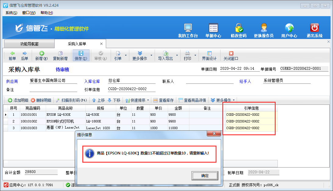 在采購貨品時有時需要先由庫存人員根據實際庫存預警情況開采購訂單,然后采購人員根據采購訂單進行采購入庫。為避免采購數量大于訂單數量進行入庫的情況,軟件支持控制采購數量不可超過訂單數量,本文以“信管飛倉庫管理軟件”為例,示范下如何設置“采購數量不可超過訂單數量”。 在功能導航窗點擊“系統管理”—》“系統參數配置”—》“業務參數”,即可進入到“業務參數”界面,在業務單據明細參數中勾選“采購數量不可超過訂單數量”參數,然后點擊“保存”按鈕保存配置,如下圖所示。 設置完之后,在功能導航窗點擊“采