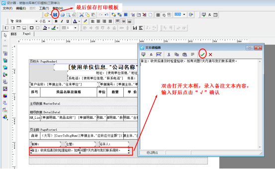 信管飛送貨單軟件、信管飛RMS、信管飛倉(cāng)庫(kù)管理軟件都支持開(kāi)單打印送貨單(銷售單),打印模板下方一般都會(huì)有備注信息或注意事項(xiàng),不同的公司備注信息也不同,客戶可以自定義修改模板的備注內(nèi)容,下面介紹一下如何修改固定的備注字樣。 以送貨單軟件為例,選擇一個(gè)送貨單單據(jù),選擇“打印”—》“打印格式設(shè)計(jì)”—》“設(shè)計(jì)格式”進(jìn)入打印模板設(shè)計(jì)器頁(yè)面,如下圖1、圖2所示:圖1圖2 在設(shè)計(jì)器上,選擇模板下方“備注”文本框,雙擊打開(kāi),輸入備注文本內(nèi)容,點(diǎn)擊“√”確定,最后保存打印模板即可。如下圖3所示:圖3&n