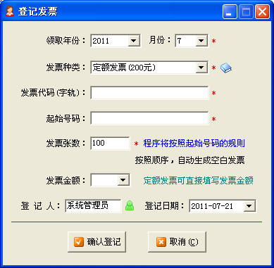 銷項發(fā)票目前主要分為定額發(fā)票、增值稅發(fā)票、一般機打發(fā)票三種,公司會計人員在稅局購領(lǐng)后,需要在第一時間內(nèi),在《紅管家財務出納記賬系統(tǒng)》中進行登記。主要登記信息包括: