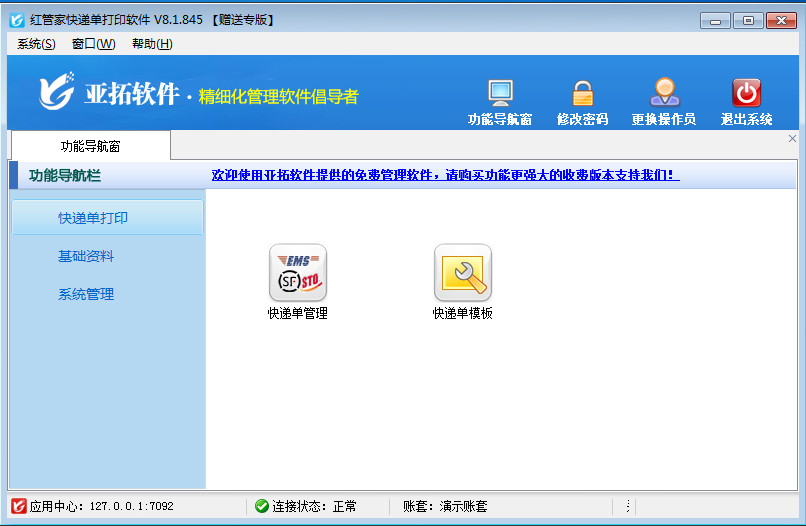 紅管家快遞單打印軟件是亞拓軟件針對企事業單位票據管理及打印需求而開發的一款快遞單套打軟件,主要包括快遞單管理、快遞單打印模板、快遞單打印、快遞單查詢等功能。