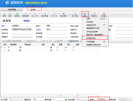 以送貨單軟件為例,選擇一個送貨單單據(jù),選擇“打印”—》“打印格式設(shè)計”—》“設(shè)計格式”進入打印模板設(shè)計器頁面,如下圖1、圖2所示: