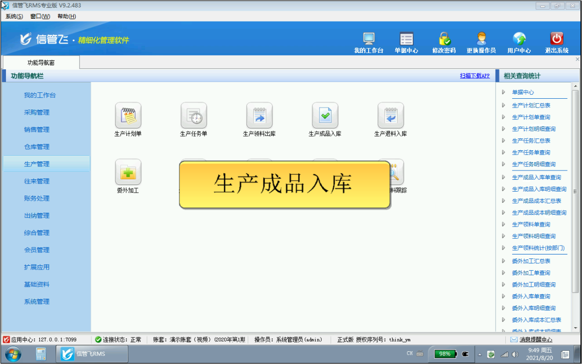 介紹信管飛RMS生產成品入庫單的主要功能和操作步驟。