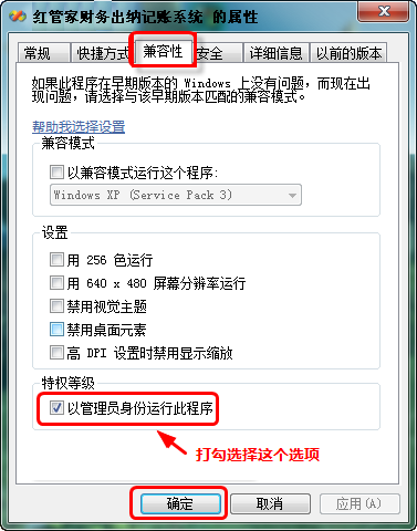 (2)系統(tǒng)會(huì)彈出屬性窗口,請?jiān)凇凹嫒菪浴睒?biāo)簽頁中選中“以管理員身份運(yùn)行此程序”復(fù)選框,然后點(diǎn)擊“確定”按鈕。