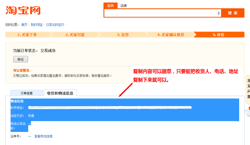 首先,打開淘寶訂單詳情頁,然后在“收貨和物流信息”中復(fù)制“圖示部分”的內(nèi)容: