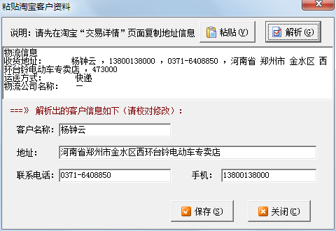 然后,在送貨單或訂單開單窗口,點(diǎn)“更多操作”->"粘貼淘寶客戶資料",在彈出的窗口中是不是客戶信息已經(jīng)解析出來了?如果需要復(fù)制其他客戶資料,重復(fù)上面的步驟,點(diǎn)“粘貼”,然后點(diǎn)“解析”按鈕即可。