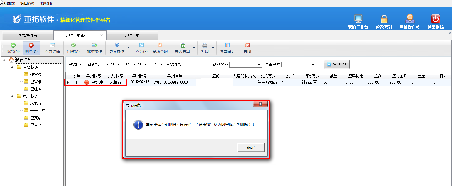 有些客戶想刪除已紅沖的單據時,發現已紅沖的單據刪除不了,如下圖所示,提示“當前單據不能刪除(只有處于“待審核”狀態的單據才可刪除)!”,那么如何刪除已紅沖的單據呢?
