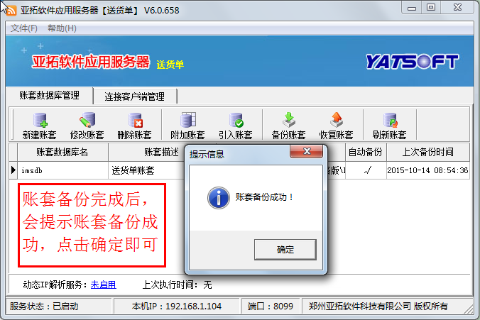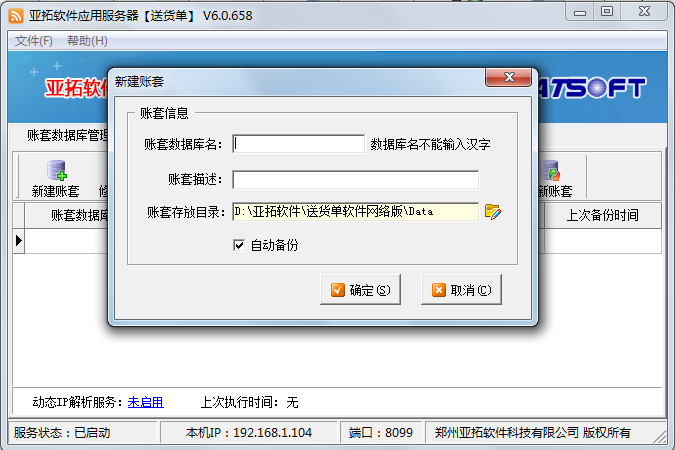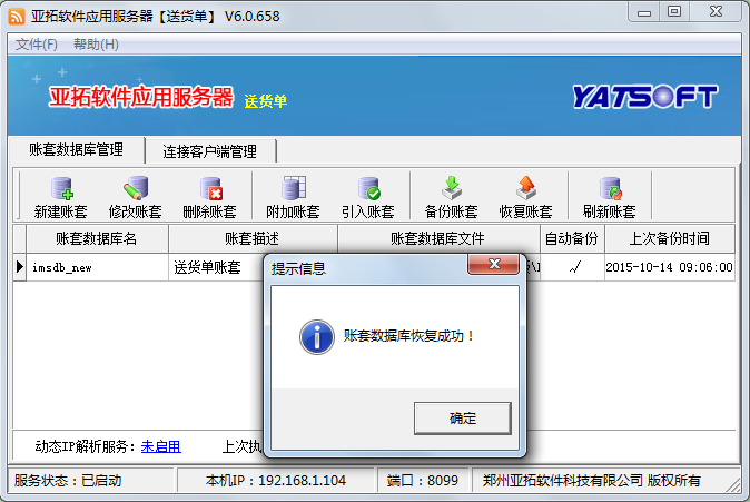 在新主機電腦上安裝軟件,打開亞拓軟件應用服務器,然后點擊“新建賬套”,執行新建賬套操作,賬套名為此前備份的賬套名,新建賬套完成后,選擇此新建的賬套,點“恢復賬套”,選擇此前拷貝過來的備份賬套文件進行恢復數據,數據恢復后,在登錄窗口選擇賬套登錄,檢查下數據是否完全恢復。