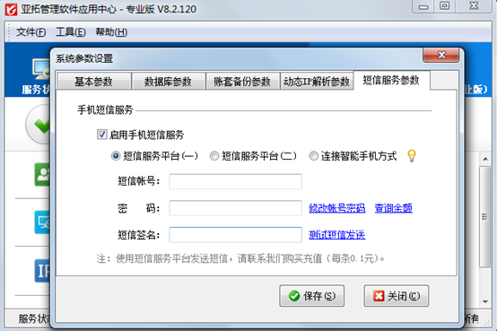 打開亞拓軟件應(yīng)用服務(wù)中心—》系統(tǒng)參數(shù)—》短信服務(wù)參數(shù),如下圖1所示。