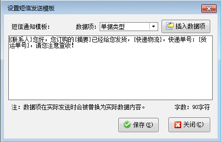 短信模板我們自己可以設(shè)置的,你可以選中你需要的數(shù)據(jù)項插入到短信模板中,這樣軟件會自動調(diào)取單據(jù)中相應(yīng)的數(shù)據(jù)項,我們在給客戶發(fā)送短信時就會提取為實際數(shù)據(jù)。