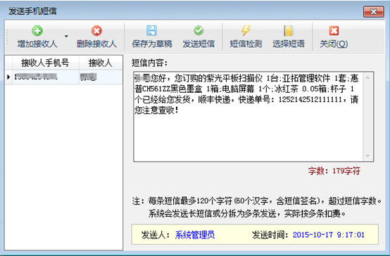 亞拓管理軟件以及紅管家送貨單軟件中集成了手機短信發(fā)送服務(wù),可以發(fā)送開單通知、發(fā)貨通知、生日祝福、應(yīng)收款催款短信等業(yè)務(wù)短信。軟件中可以設(shè)置短信模板,系統(tǒng)會自動調(diào)取單據(jù)中的內(nèi)容,無需我們手動輸入繁瑣的內(nèi)容,可以節(jié)約我們寶貴的時間和精力。軟件也支持自定義發(fā)送短信。統(tǒng)一采用1065全國全網(wǎng)正規(guī)通道,速度更快,更能提升企業(yè)形象,軟件只能發(fā)送發(fā)貨通知等業(yè)務(wù)短信,嚴禁群發(fā)營銷短信。