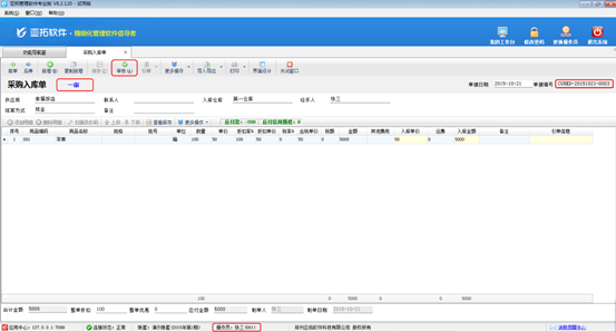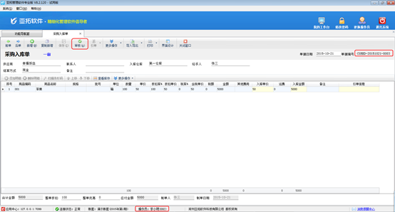 操作員“張三”登錄亞拓管理軟件,開(kāi)過(guò)采購(gòu)入庫(kù)單進(jìn)行保存審核,審核后單據(jù)狀態(tài)變?yōu)椤耙粚彙保鐖D4所示。