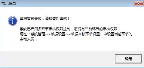 操作員“張三”沒(méi)有“二審”權(quán)限,進(jìn)行“一審”后,再點(diǎn)擊“審核”按鈕,會(huì)提示圖5所示的提示信息。
