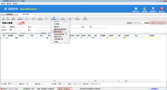 操作員“李小明”登錄亞拓管理軟件找到剛才的那個(gè)采購(gòu)入庫(kù)單,單據(jù)狀態(tài)為“一審”。