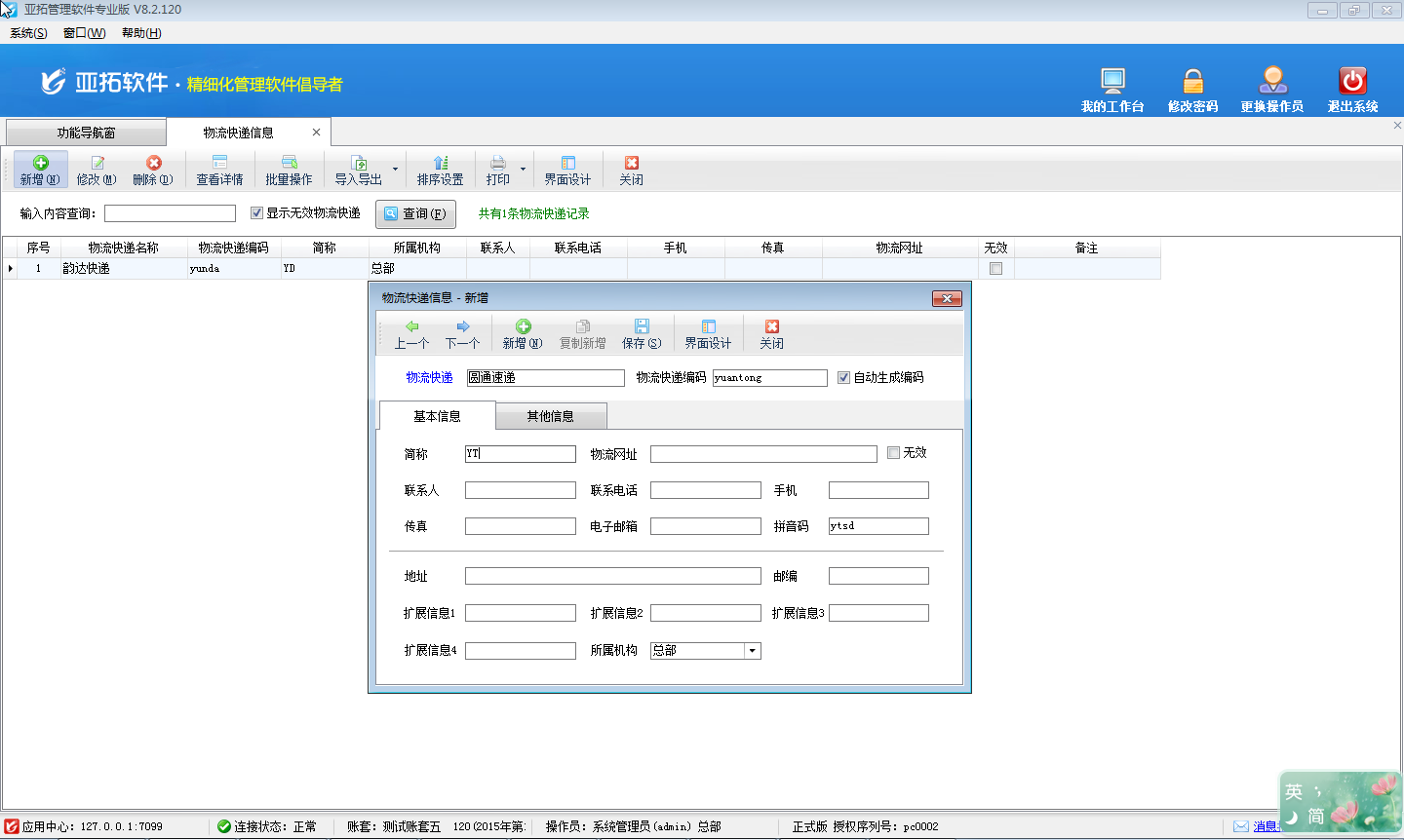 打開亞拓管理軟件,點“基礎(chǔ)資料”——》“物流快遞”窗口,新增物流快遞信息。如下圖一所示。