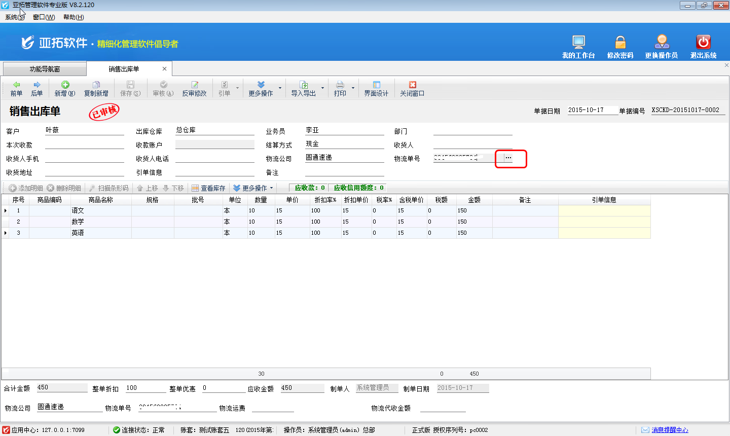 亞拓軟件開發(fā)的新架構(gòu)進銷存軟件——亞拓管理軟件具有跟蹤查詢物流信息的功能,自亞拓管理軟件V8.2.117版本起,銷售訂單、銷售出庫單中的物流單號輸入框增加右邊銨鈕,點擊可直接跟蹤物流單的配送情況。下面我們就詳細介紹下如何在亞拓管理軟件內(nèi)直接跟蹤貨物的物流信息。