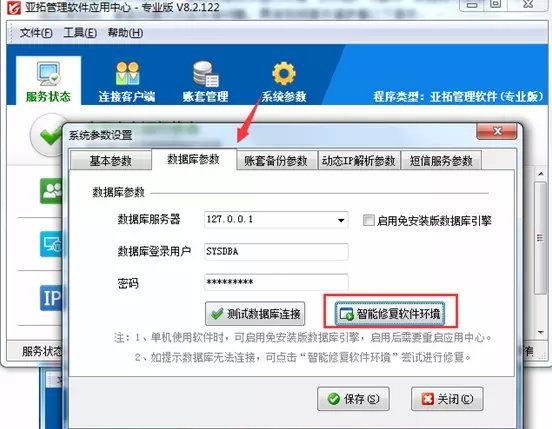 2、點(diǎn)擊“系統(tǒng)參數(shù)”,在“數(shù)據(jù)庫(kù)參數(shù)”頁(yè)點(diǎn)擊“智能修改軟件環(huán)境”。(也可點(diǎn)擊菜單“幫助----智能修復(fù)軟件環(huán)境”)