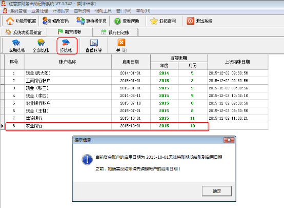 重新打開期末結賬窗口,可以看到“農業銀行”賬戶的“啟用日期”發生了變化,如圖7所示,此時可以對該資金賬戶進行反結賬操作。