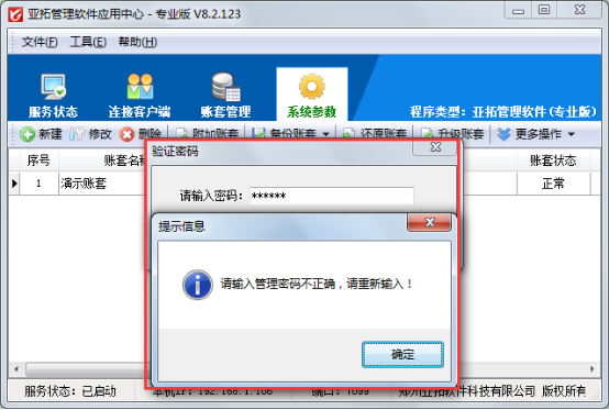 啟用安全驗證之后,我們如果需要進行新建賬套、修改賬套、刪除賬套、還原賬套、升級賬套、修改系統參數設置等操作時,系統會要求輸入驗證密碼,驗證通過后才可以繼續相應操作,如果輸入密碼錯誤或者是不輸入密碼,則不能繼續進行相應操作。