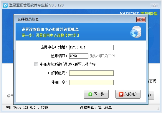 點擊桌面上的“亞拓管理軟件”程序(以下簡稱“客戶端程序”)圖標(或者在開始菜單中點擊程序組中的相應功能),即可打開客戶端程序。點“選擇賬套”按鈕,可以輸入“應用中心”所在電腦(即主機電腦)的IP地址以及通訊端口,如果是通過互聯網遠程連接請輸入購買動態IP解析服務后我們提供的IP解析帳號和使用口令,然后點“下一步”按鈕,選擇要登錄的賬套。