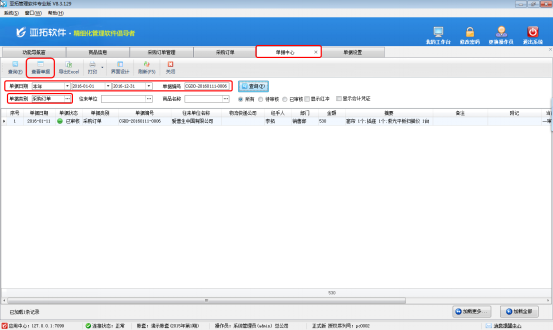 情況二:具體的單據編號不清楚,但是知道單據類別及此單中存在某種商品或者是往來單位信息,可以在單據中心中選擇單據日期,并選擇相應的查詢內容進行查詢,如需要查詢本年內包含某商品的采購訂單,單據日期可以選擇本年,然后選擇相應單據類別及商品名稱進行查詢即可查詢出所查詢的時間段內包含此商品的所有訂單,然后可以在所查詢的內容中選擇所需要的訂單,如下圖三所示。