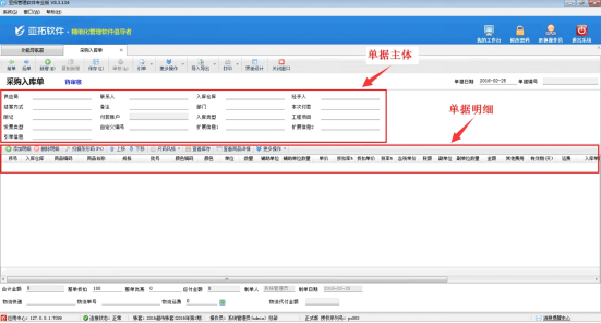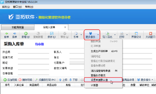 下面我們以亞拓管理軟件專業(yè)版采購入庫單為例詳細介紹下如何在亞拓管理軟件中設(shè)置單據(jù)默認值。