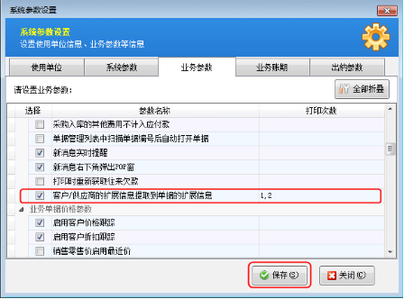 在功能導航窗點“系統管理”—》“系統參數配置”即可進入“系統參數設置”界面,如圖1所示,勾選“客戶/供應商的擴展信息提取到單據的擴展信息”,在這一行的后面輸入相應提取的擴展信息編號,例如,提取擴展信息1和擴展信息2,則需要輸入“1,2”,用英文的逗號間隔,設置后點擊“保存”按鈕。