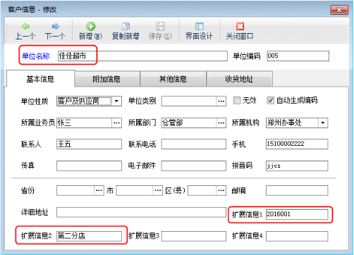 注:客戶/供應商的擴展信息一共有四個可以使用,擴展信息的名字可以通過界面設計進行修改。