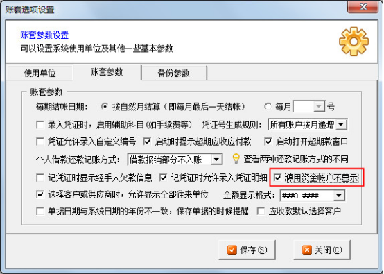 2、設置停用賬戶不顯示:點擊主窗口“系統管理”—》“賬套參數”中“賬套參數”,將“停用資金賬戶不顯示”選項勾選上,然后點擊保存接即可,此時我們在現金日記賬界面上就不會出現現金01這個賬戶的信息,如下圖3、4所示: