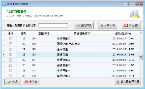 在功能導航窗點“票據打印”—》“萬能票據打印”,點擊“在線下載模板”按鈕,系統彈出“在線下載模板”窗口,選擇需要下載的票據模板后,可以預覽樣式并下載。