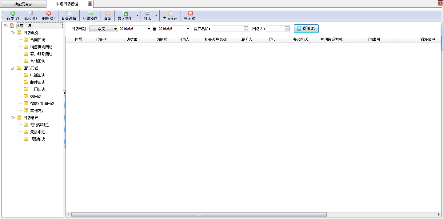 點(diǎn)擊界面左側(cè)導(dǎo)航樹中的回訪類別、回訪形式、回訪結(jié)果等分類條件,可以查詢相應(yīng)的回訪記錄。