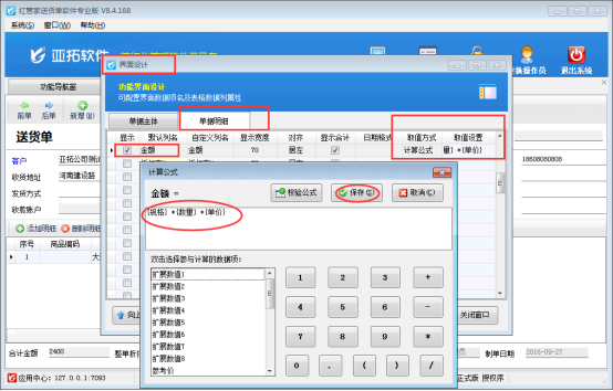 設置好參數后,功能導航欄點擊“業務處理”新開送貨單,打開界面設計選擇“單據明細”的金額,金額的取值方式選擇“計算公式”;取值設置設置為“{規格} *{數量} *{單價}”保存計算公式,最后保存界面設計。操作步驟如下圖: