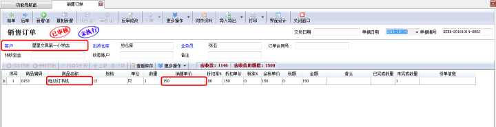設(shè)置完成之后,在功能導(dǎo)航窗點(diǎn)擊“銷售管理”——》“銷售訂單”,新增銷售訂單,客戶“星星文具第一小學(xué)店”需要訂購商品“電動訂書機(jī)”,銷售單價為150元。如下圖二所示。