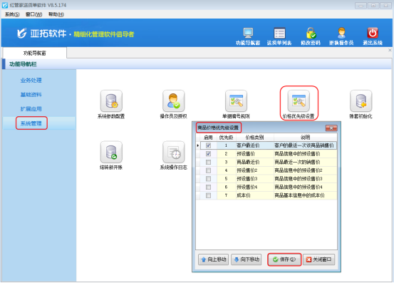 在功能導(dǎo)航窗點(diǎn)“系統(tǒng)管理”—》“價(jià)格優(yōu)先級(jí)設(shè)置”即可進(jìn)入“價(jià)格優(yōu)先級(jí)設(shè)置”窗口,如圖1所示。