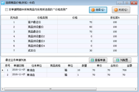 如果我們選擇新增加的商品,商品信息里輸入的有商品的預(yù)設(shè)售價(jià),那么由于沒(méi)有該商品的客戶最近價(jià),軟件會(huì)自動(dòng)調(diào)取出商品的預(yù)設(shè)售價(jià),我們可以在明細(xì)欄中點(diǎn)“選擇價(jià)格”查看不同類(lèi)別的價(jià)格以及最近業(yè)務(wù)單據(jù),如圖4所示。