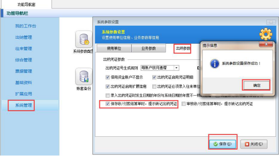 下邊以應收款結算為例,介紹如何設置結算提醒轉記憑證,左側導航欄選擇系統管理,打開系統參數配置,選擇出納參數,勾選上“保存收/付款結算單時,提示轉記出納憑證”保存參數,具體如下圖所示: