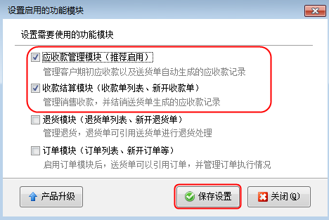 點擊“設置啟用的功能模塊”按鈕,系統彈出“設置啟用的功能模塊”窗口,如圖2所示,一共分為四個功能模塊組:應收款管理模塊、收款結算模塊、退貨模塊、訂單模塊。軟件默認顯示全部的功能模塊,現在我們只勾選應收款管理模塊和收款結算模塊,取消勾選退貨模塊和訂單模塊,然后點擊“保存設置”按鈕。