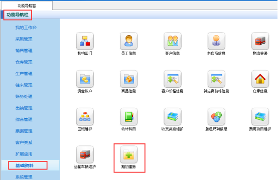 以亞拓管理軟件專業版本為例,示范如何修改賬套啟用后的客戶期初應收應付款,選擇“功能導航窗”的“基礎資料”選項,進入基礎資料窗口,選擇“期初建賬”,進入“期初應收應付”界面,流程如下圖所示: