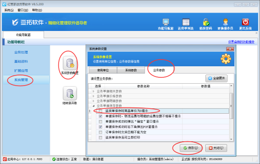 在功能導(dǎo)航窗點(diǎn)擊“系統(tǒng)管理”—》“系統(tǒng)參數(shù)配置”—》“業(yè)務(wù)參數(shù)”,即可進(jìn)入到“業(yè)務(wù)參數(shù)”配置界面,在業(yè)務(wù)單據(jù)保存參數(shù)內(nèi)找到“送貨單保存時(shí)商品單價(jià)為0提示”參數(shù),把這個(gè)參數(shù)的勾選去掉,然后保存,如下圖二所示。
