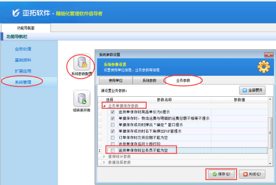 在功能導航窗選擇系統管理—》系統參數配置,即可進去“系統參數設置界面”,點擊業務參數,在業務單據保存參數中找到“送貨單保存時業務員不能為空”參數,把前邊的勾選符號去掉,然后保存,如圖2所示: