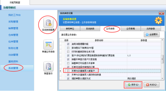 在功能導航窗選擇“系統管理”—》“系統參數配置”—》“業務參數”,在業務參數中的業務單據相關參數中把“開單允許直接錄入新客戶”勾選符號取消,保存參數設置,如下圖1所示: