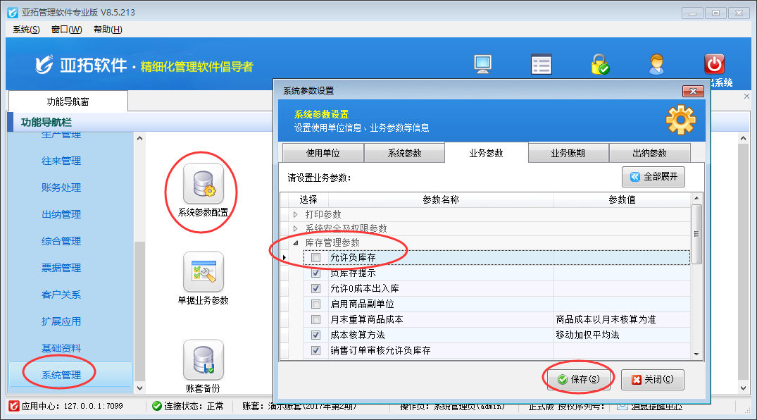 在功能導(dǎo)航窗點(diǎn)擊“系統(tǒng)管理”—》“系統(tǒng)參數(shù)配置”—》“業(yè)務(wù)參數(shù)”,即可進(jìn)入到“業(yè)務(wù)參數(shù)”配置界面,在庫存管理參數(shù)內(nèi)找到“允許負(fù)庫存”參數(shù),把這個參數(shù)的勾選去掉,然后保存,如下圖一所示。