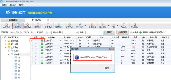在功能導(dǎo)航窗點(diǎn)“出納管理”—》“銀行日記賬”即可進(jìn)入“銀行日記賬”界面,對(duì)“已審核”的憑證進(jìn)行修改時(shí),系統(tǒng)會(huì)提示“當(dāng)前憑證已審核,無法進(jìn)行修改!”,如圖1所示。