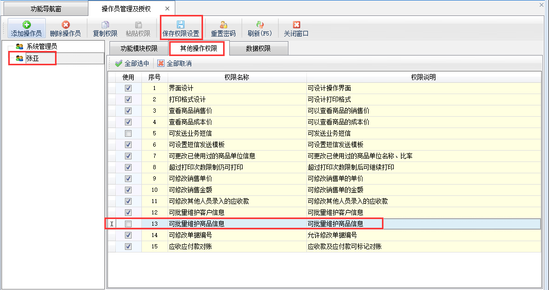 在功能導(dǎo)航窗點(diǎn)“系統(tǒng)管理”→“操作員及授權(quán)”即可進(jìn)入“操作員管理及授權(quán)”界面,選中操作員賬號(hào),在“其他操作權(quán)限”界面將“可批量維護(hù)商品信息”權(quán)限打鉤取消,然后保存權(quán)限設(shè)置,如下圖一所示,設(shè)置操作員“張亞”沒(méi)有“可批量維護(hù)商品信息”權(quán)限。