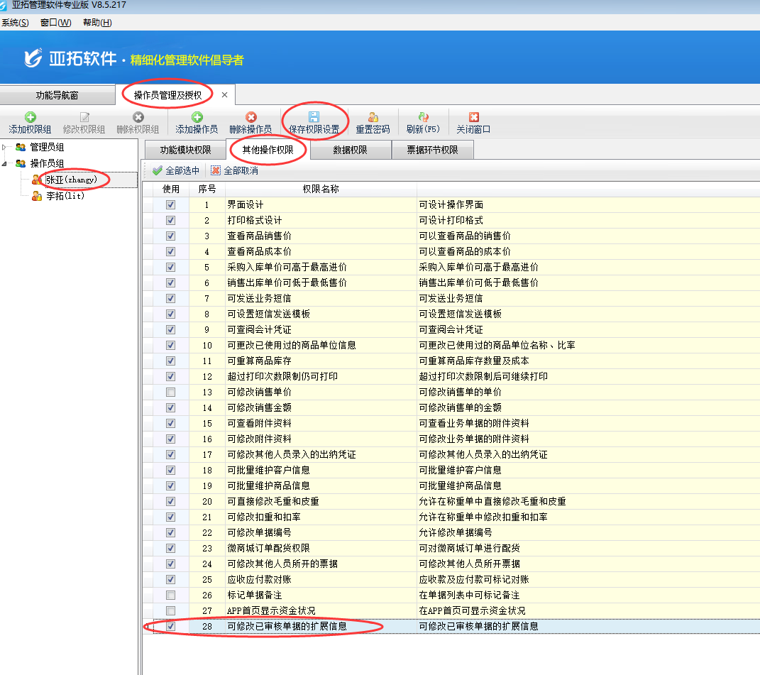 在功能導航窗點“系統管理”→“操作員及授權”即可進入“操作員管理及授權”界面,選中操作員賬號,在“其他操作權限”界面將“可修改已審核單據的擴展信息”權限勾選上,如下圖一所示,設置操作員賬號“張亞”可以直接修改已審核單據的擴展信息,設置完成后點擊“保存權限設置”按鈕保存設置。