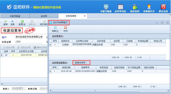 在送貨單單據界面工具欄“更多操作”下的選擇“查看應收款及結銷情況”,彈出應收及結算情況界面,點擊“查看結算單”可以快速到達該送貨單的收款結算單界面,如下圖2所示: