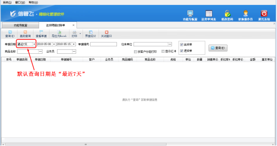 信管飛送貨單軟件、信管飛RMS(進銷存軟件)、信管飛倉庫管理軟件內都包含了統計查詢功能(單據匯總表、單據明細表等統計查詢報表),軟件內統計查詢功能默認的查詢日期為“最近7天”(如下圖1所示),但是如果需要修改默認查詢日期,該如何修改呢?下面我們以信管飛送貨單軟件為例詳細介紹下軟件內如何修改默認查詢日期。