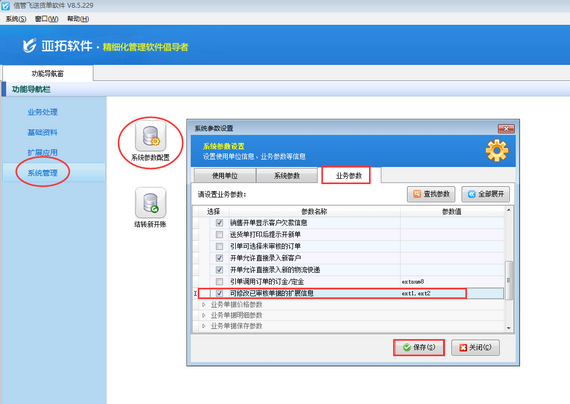 在功能導航窗點擊“系統(tǒng)管理”→“系統(tǒng)參數(shù)設置”→“業(yè)務參數(shù)”可以進入到“業(yè)務參數(shù)”配置界面,在業(yè)務單據(jù)相關參數(shù)內(nèi)打勾啟用“可修改已審核單據(jù)的擴展信息”參數(shù),并設置參數(shù)值(擴展信息字段名),默認為“ext1,ext2(擴展信息1,擴展信息2)”,如下圖一所示。